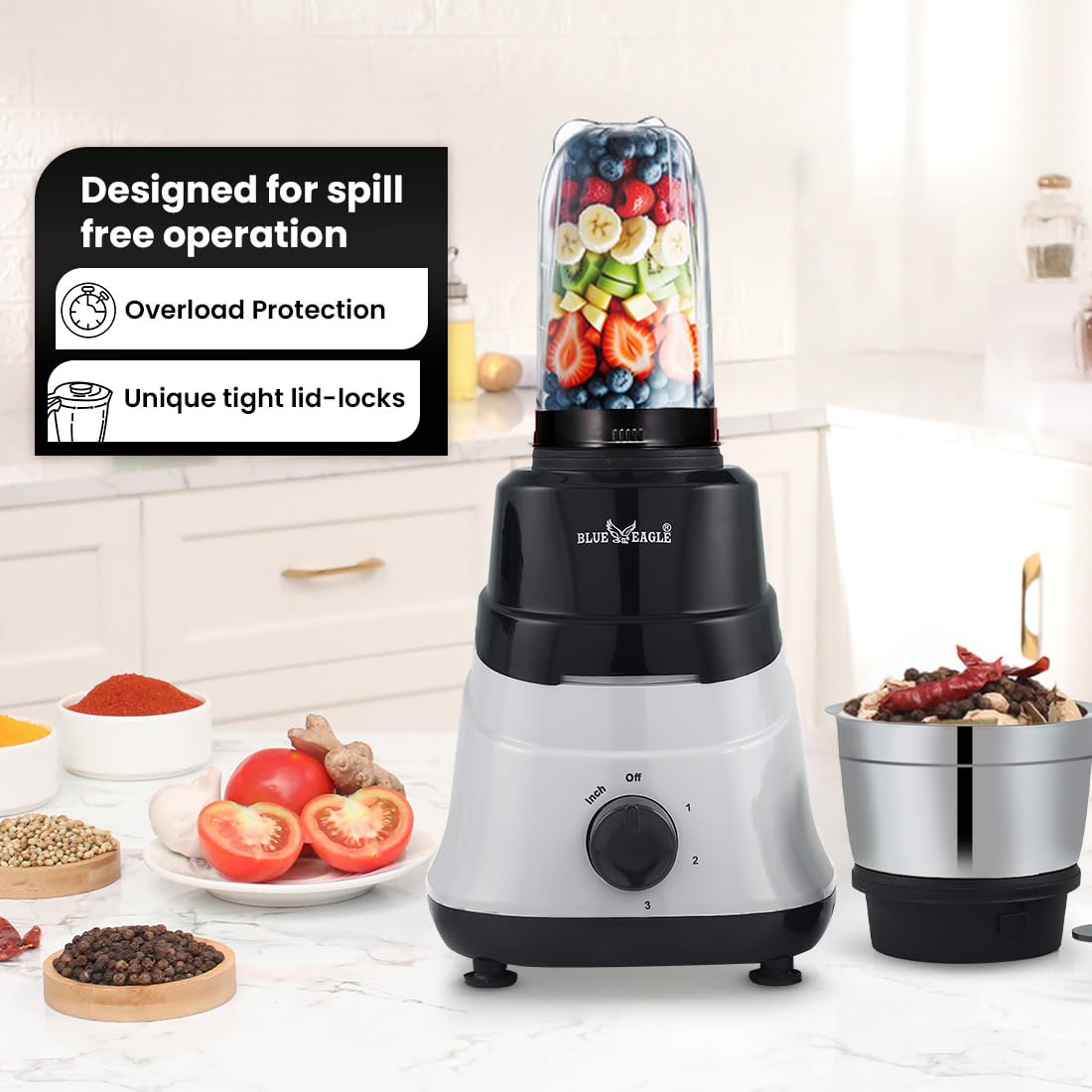 If you are looking for a budget friendly and powerful mixer grinder, then the Blue Eagle’s 4 Jar Mixer Grinder is an ideal option for you. It is made of best-grade ABS plastic that doesn’t corrode with time. It is powered by a strong 750-Watt hybrid motor and 3-Speed control knob that provides longevity, smooth and quiet operations. You just need to turn the knob and it will blend or grind or shred the toughest ingredients effortlessly within a minute. It comes with the leakage-proof 1.4 litres Blending jar, 0.7 litres Griding jar and two nutri jars of 0.4 litres 0.6 litres for smoothies and shakes. It has smart overload protection system and advanced air ventilation system that gives you the confidence of break down free continuous 25 minutes grinding experience. It can be used for making juices, pastes, chutneys, smoothies, grinding coffee beans, spices and mixing dry or wet ingredients. It is the perfect addition to your kitchen to make your cooking process efficient and quick.