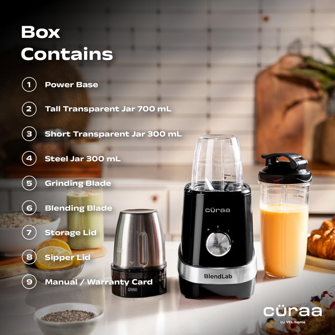 The Cüraa by YFL Home BlendLab packs high-speed performance with its powerful 400W copper motor, engineered to minimize heat build-up. With dual speed settings and a pulse function, you can easily switch from coarse masalas to silky-smooth smoothies—making it the ultimate everyday blender and grinder for your kitchen.