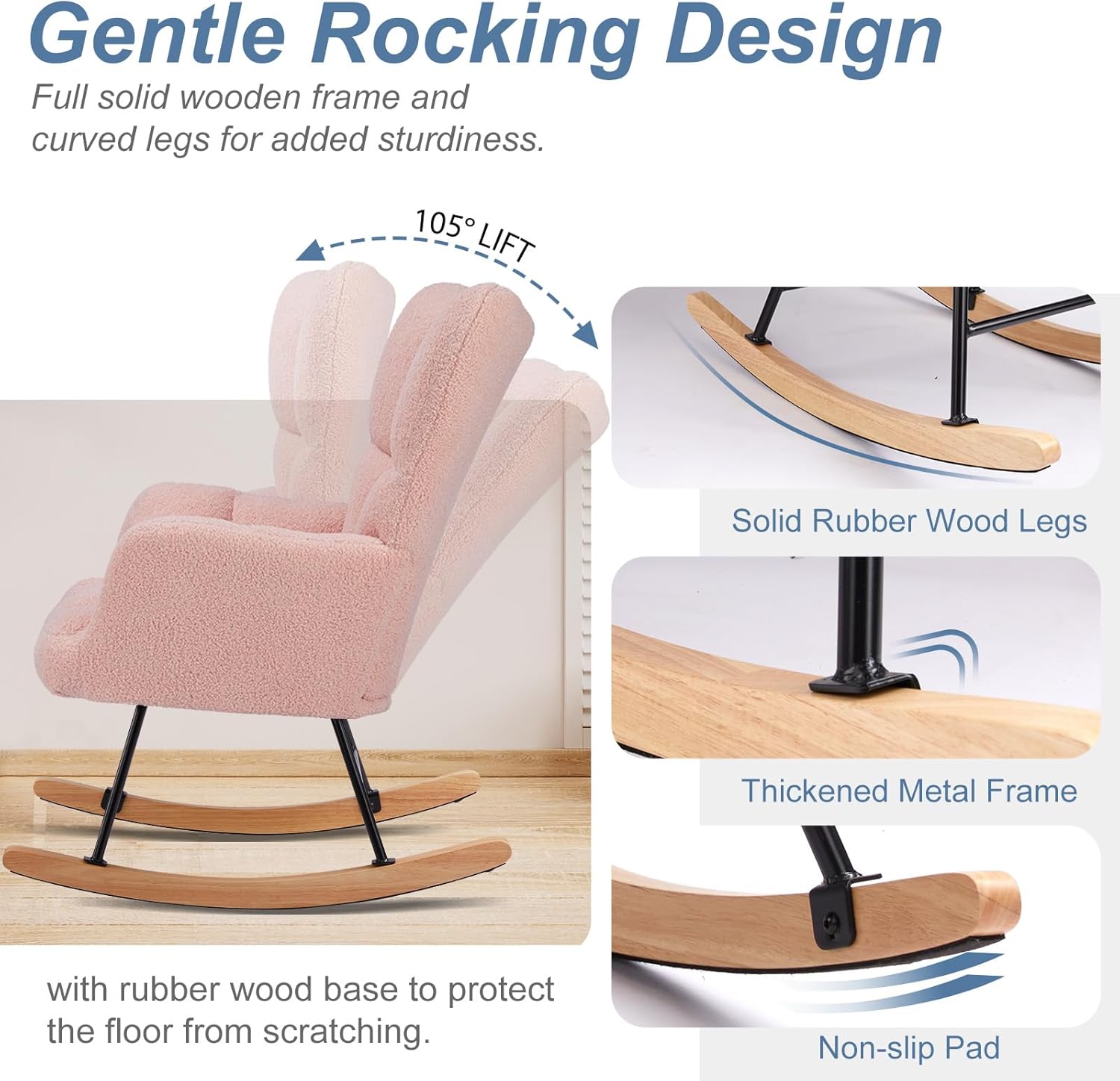 DURABLE FRAME – The nursing chair is constructed with a sturdy steel and solid wood frame, guaranteeing excellent stability and a high load capacity of 250 lbs. The long curved legs with foot pads are made of solid wood, providing protection for your floor.
