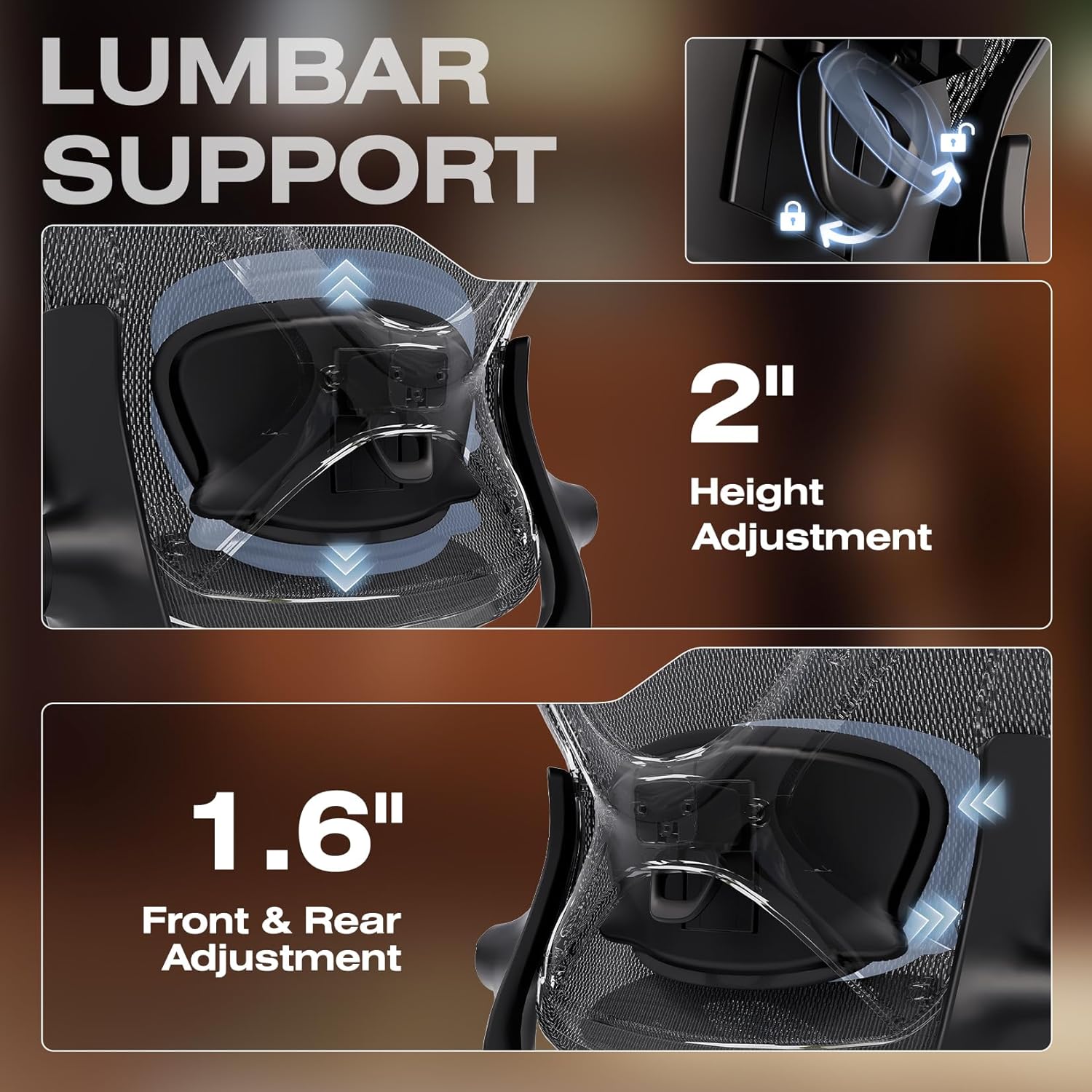 【Engineered with Dynamic Spinal Alignment System】3D Synchro-Tilt Lumbar(Lockable ±1.6″ depth spring-loaded auto-tracking/±2″ height/15° rotation)with force-sensitive springs mimics natural spine curvature, certified by AEP* for 12hrs+ fatigue reduction in ergonomic chairs (*American Ergonomics Partnership)