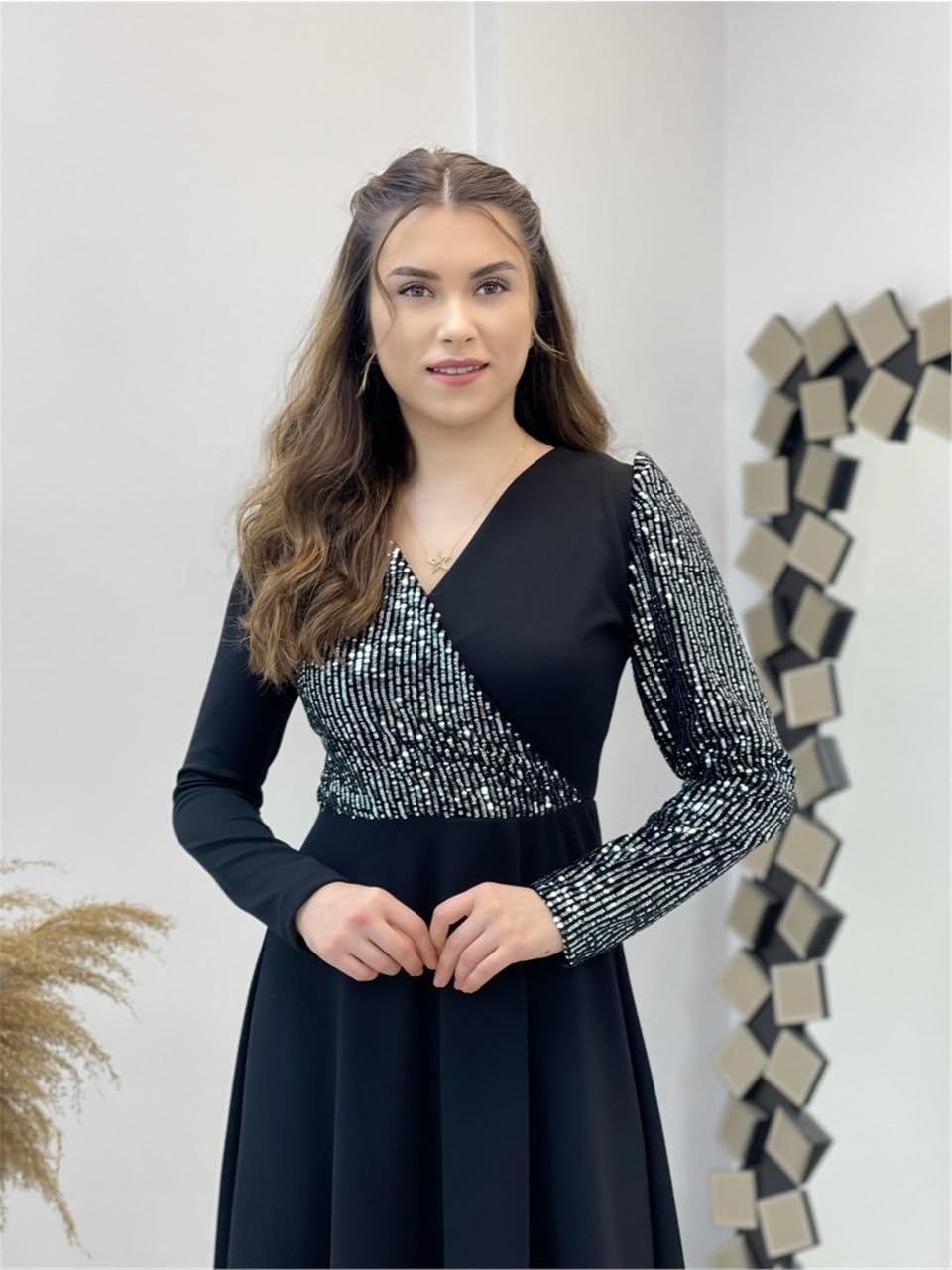 Make a stunning entrance in this elegant floor-length evening gown. The dress features a sophisticated V-neckline and dramatic long sleeves adorned with sparkling sequins that catch the light beautifully. The bodice is expertly crafted with sequin embellishments that transition seamlessly into a flowing, black skirt that sweeps gracefully to the floor. The wrap-style top creates a flattering silhouette, while the full-length A-line skirt provides elegant movement. Perfect for formal events, black-tie occasions, or evening galas, this gown combines timeless sophistication with modern glamour. The dress is crafted from premium fabric that ensures comfort throughout your special evening. The classic black colour makes it a versatile addition to any formal wardrobe. The fitted waist and flowing skirt create a balanced, feminine silhouette suitable for various body types. Please refer to the size chart for the perfect fit.
