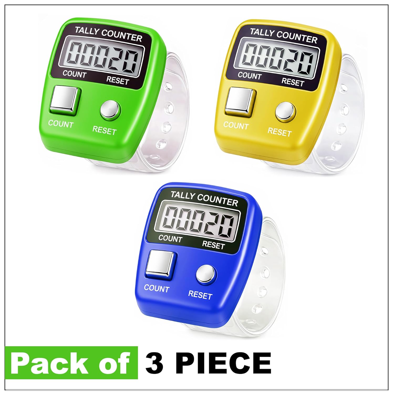 The Pack of 3 Finger Crowd Head Counters is a precise and easy-to-use digital counting device designed for crowd counting, event management, Jaap, mala chanting, and other counting needs. Equipped with a 5-digit LCD, this electronic finger counter accurately records counts to 99,999, helping you keep track without any errors.