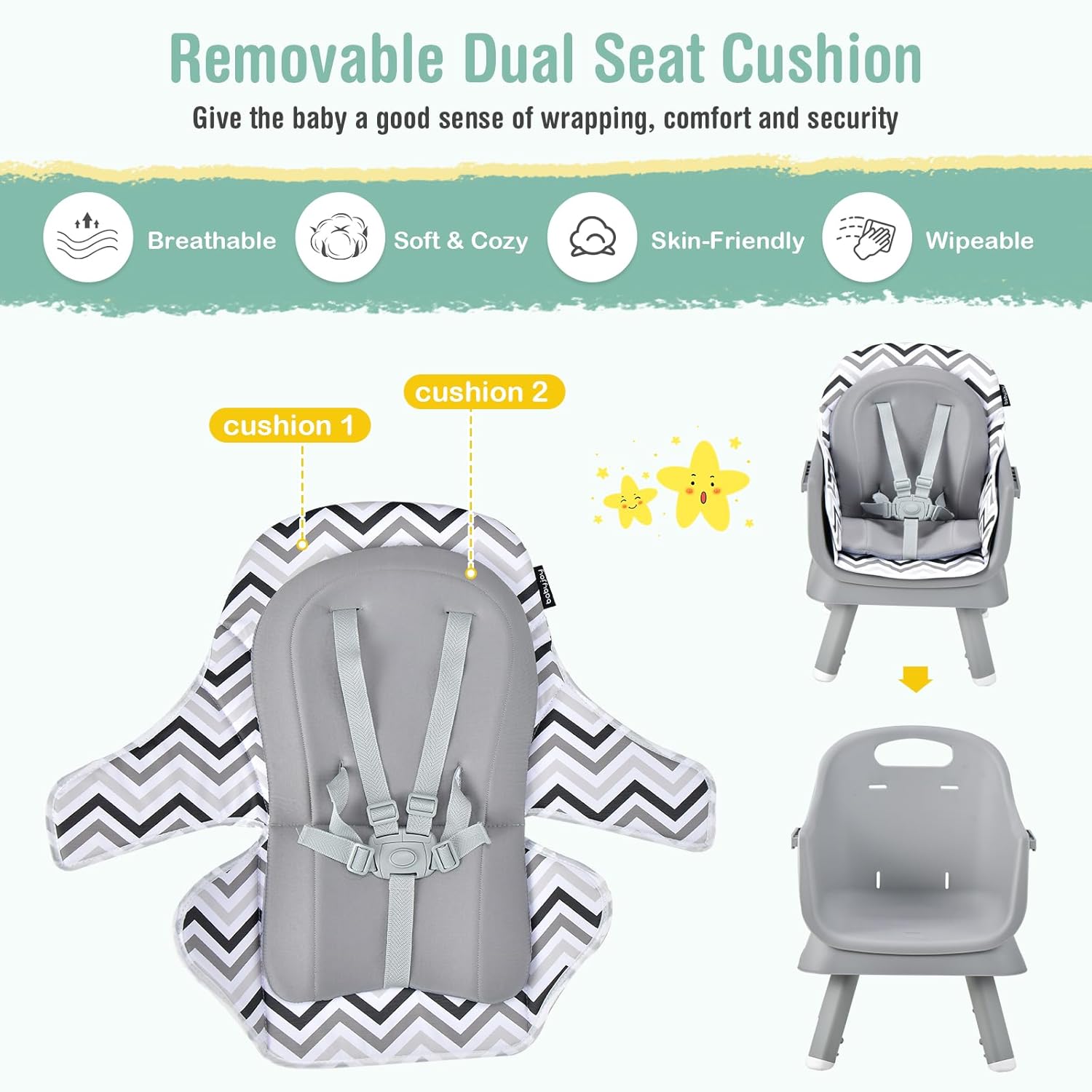 【Safe Structure & Comfy Cushion】The toddler high chair is designed with pyramid structure and the 4 non-slip foot covers, which enhance stability and protect the floor from scratches. And the double-layer cushion with 5-point harness and anti-falling baffle promises comfort and security. 3-position food tray also provides a comfy seat for grown up babies.