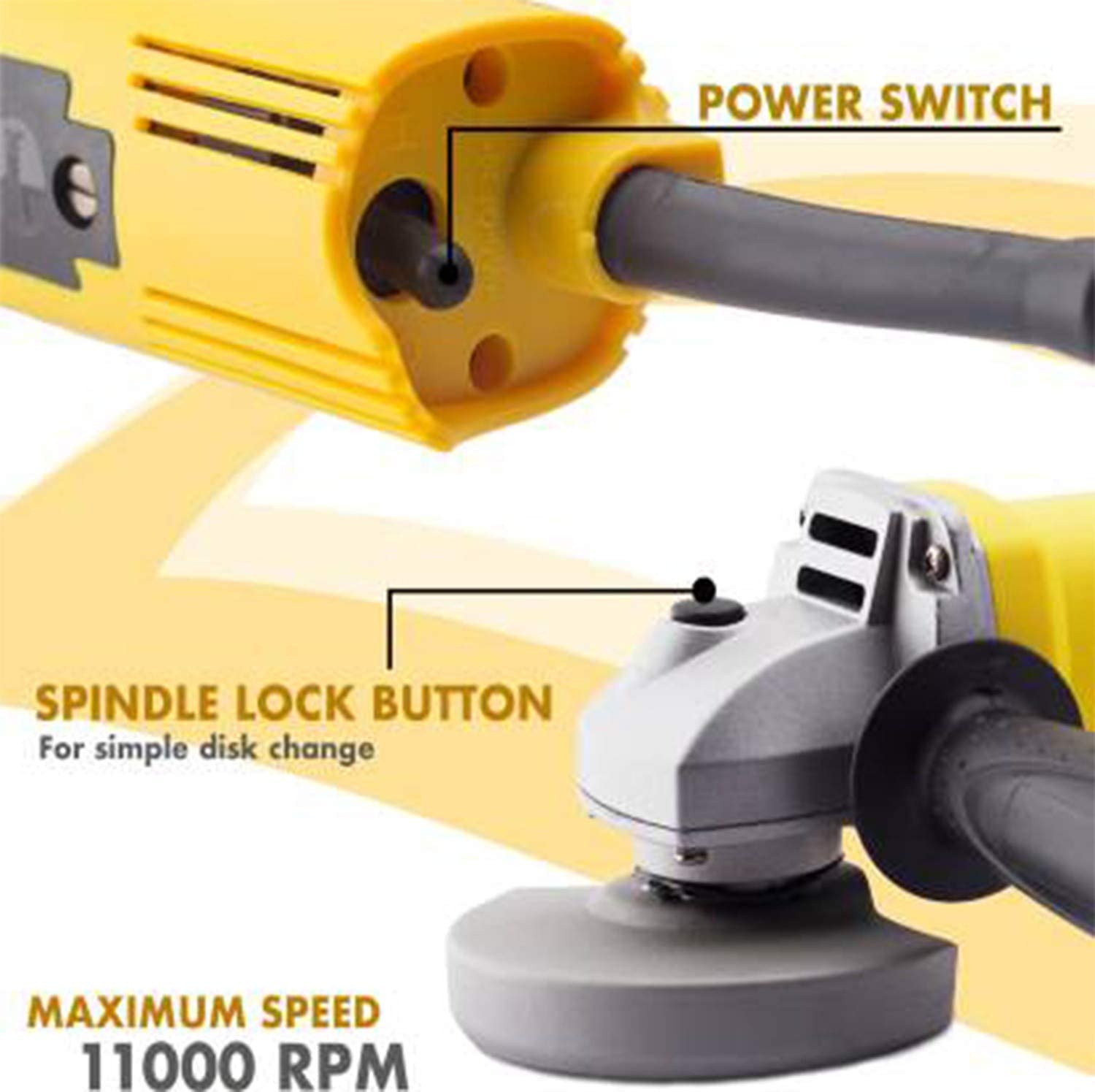 Disc diameter 100 millimeter (4 inch); no load speed 11000 rpm Sealed toggle switch provides protection from dust and filings extending switch life. Grinding wheel shown in the image & side handle do not form part of the product. Tool-free adjustable guard allows easy positioning for left or right handed use. Compact gear case allows use in tight and confined areas. Spindle lock for quick and easy disc changes