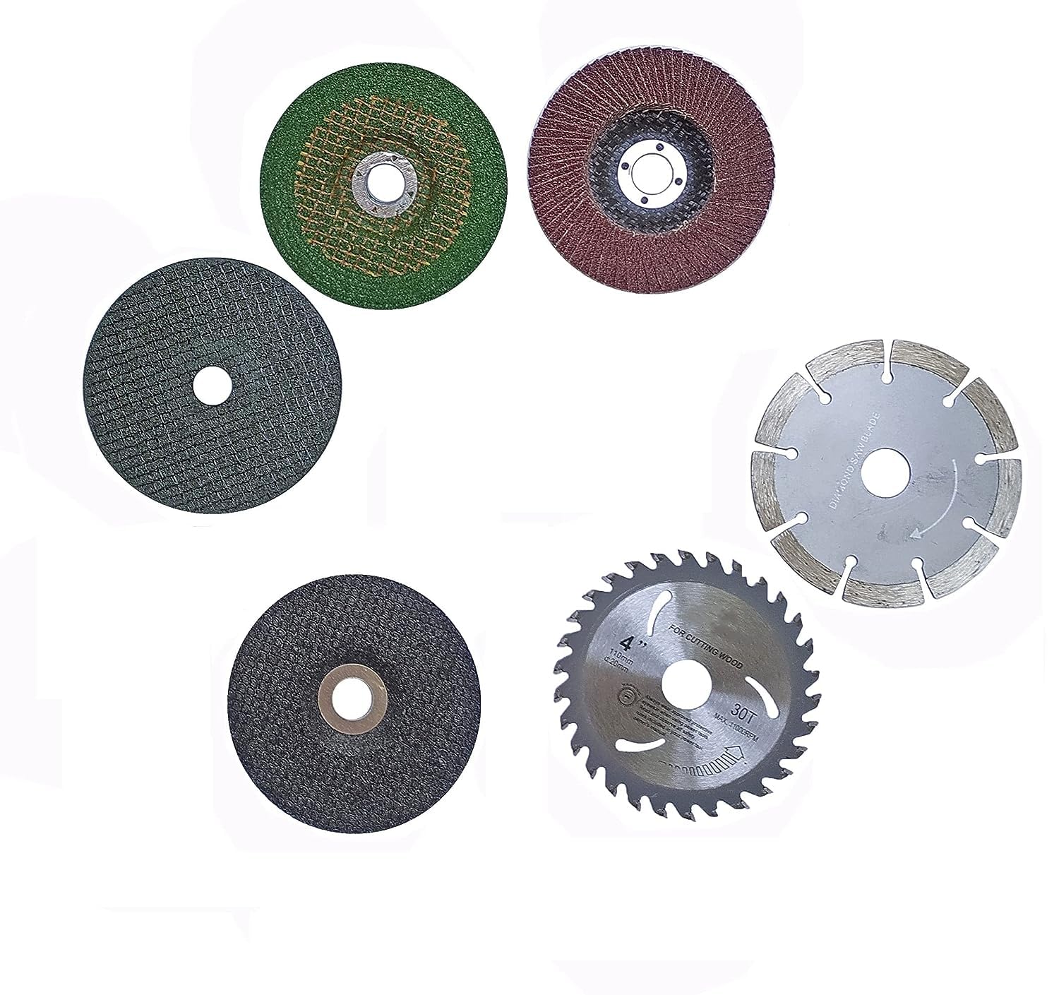 1pc wood cutting, 1 pc marble cutting, 1pc metal cutting, 1 pc grinding wheel, 1 pc GC wheel, 1pc flap wheel