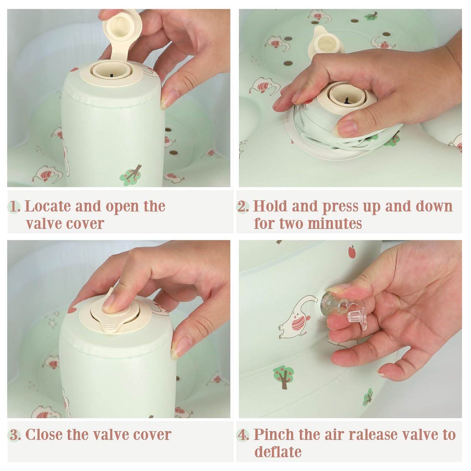 Built In Air Pump: The sit me up floor seat for baby can be easily inflated by pressing up and down on the built-in inflatable pump, the sit up chair for babies is designed to be leak-proof, the valve needs to be squeezed when deflating, easy to fold and store