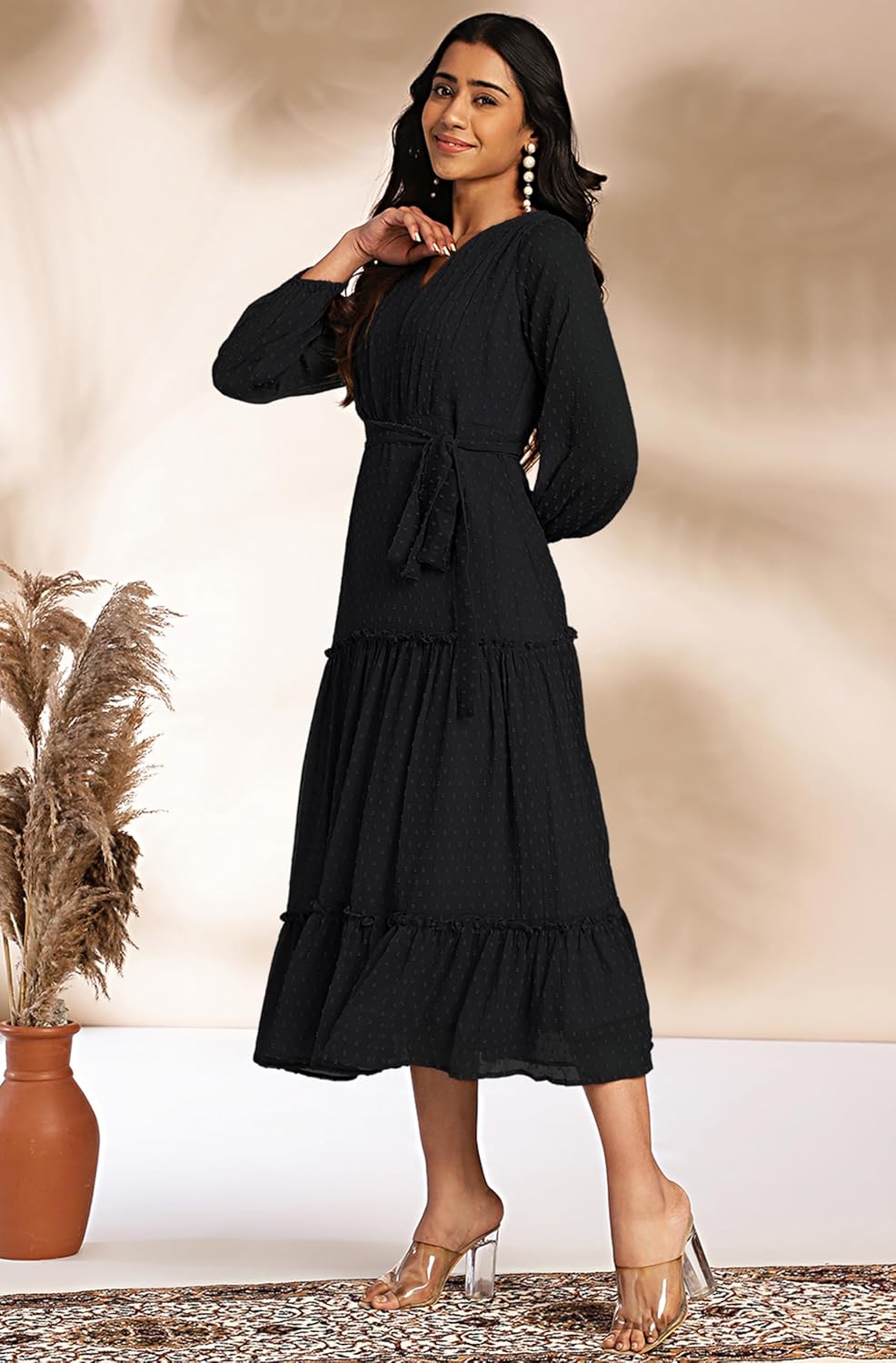 Step up your style game with this layered Dress. Crafted from dobby chiffon in a serene sage hue, this floor-length dress features a V-neck, full bell sleeves, and a flared fit. Ideal for casual or evening occasions, the dress offers timeless charm with its dobby detailing. Pair it with block heels. Maintain the fabric with gentle handwashing.