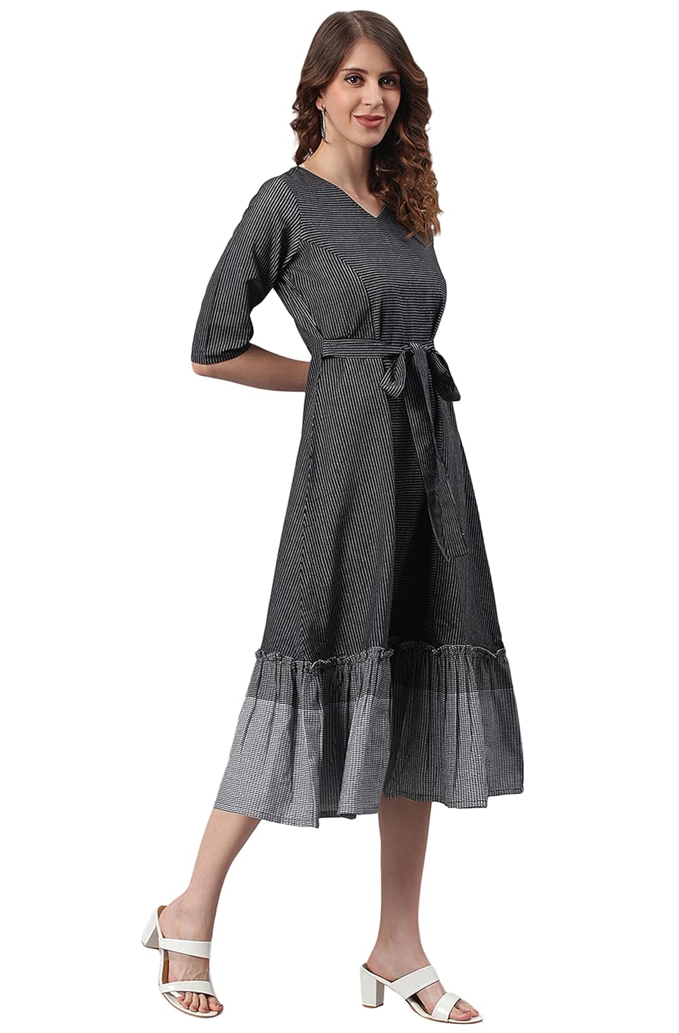 Premium Collection by Janasya. Show off that elegant style of yours by wearing this striped dress by janasya. Made with premium quality cotton, this princess cut V-neckline dress has that old world charm in it which is enhanced by frills on hemline. The best part is it comes with a conceled pocket on side. Pair this dress with sandals.
