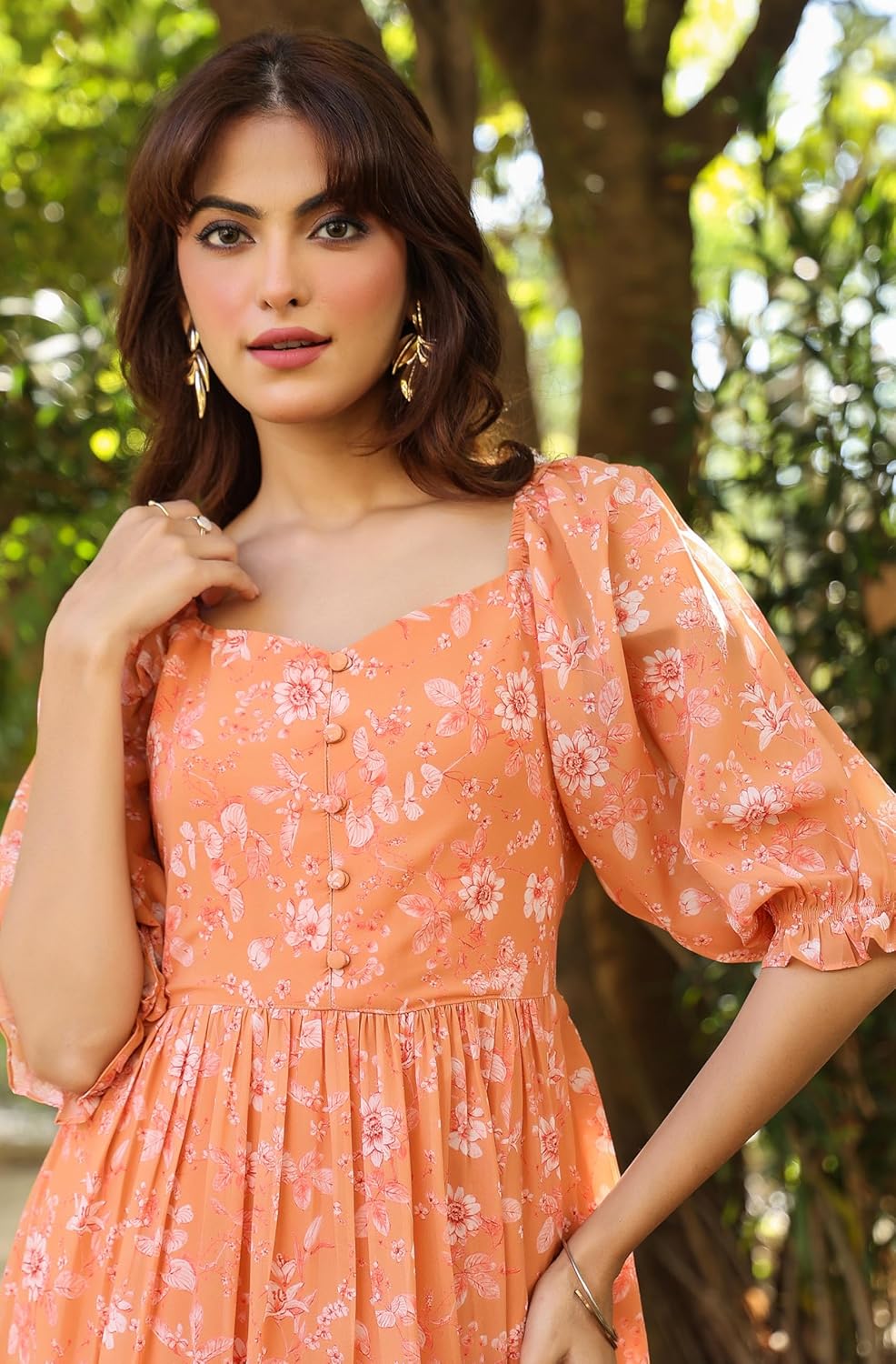 This orange georgette floral printed tiered dress is perfect for a chic yet casual look. Featuring a stylish v-neck with button ornamentation, cinched waist, and feminine balloon sleeves, it flatters your silhouette effortlessly. The tiered skirt adds a playful touch, making it ideal for a picnic or a day out.
