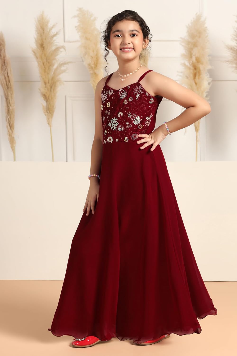 Dress your little girls with this blue color ankle length girls dress from Jwalin available on Amazon. Pair it up with a cute hair accessory and closed shoes for her to shine at the best friend’s birthday party. Give your kids a unique look with this stylish embroidered dress. This dress is crafted from georgette fabric with butter crepe lining. It’s features round neck with back button closure, sleeveless bodice and sequence embroidery on the yoke which gives your girl look even more stylish. Fit and flare style with attached self-fabricated belt makes it ideal for party wear also festive. This maxi dress is the perfect statement piece for any festive occasion. Style this dress with her favorite flats or heels and use light jewelry to make her look more beautiful.