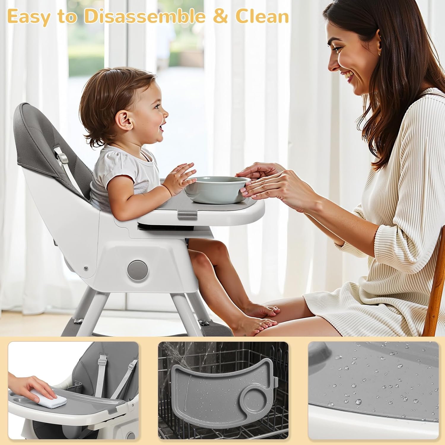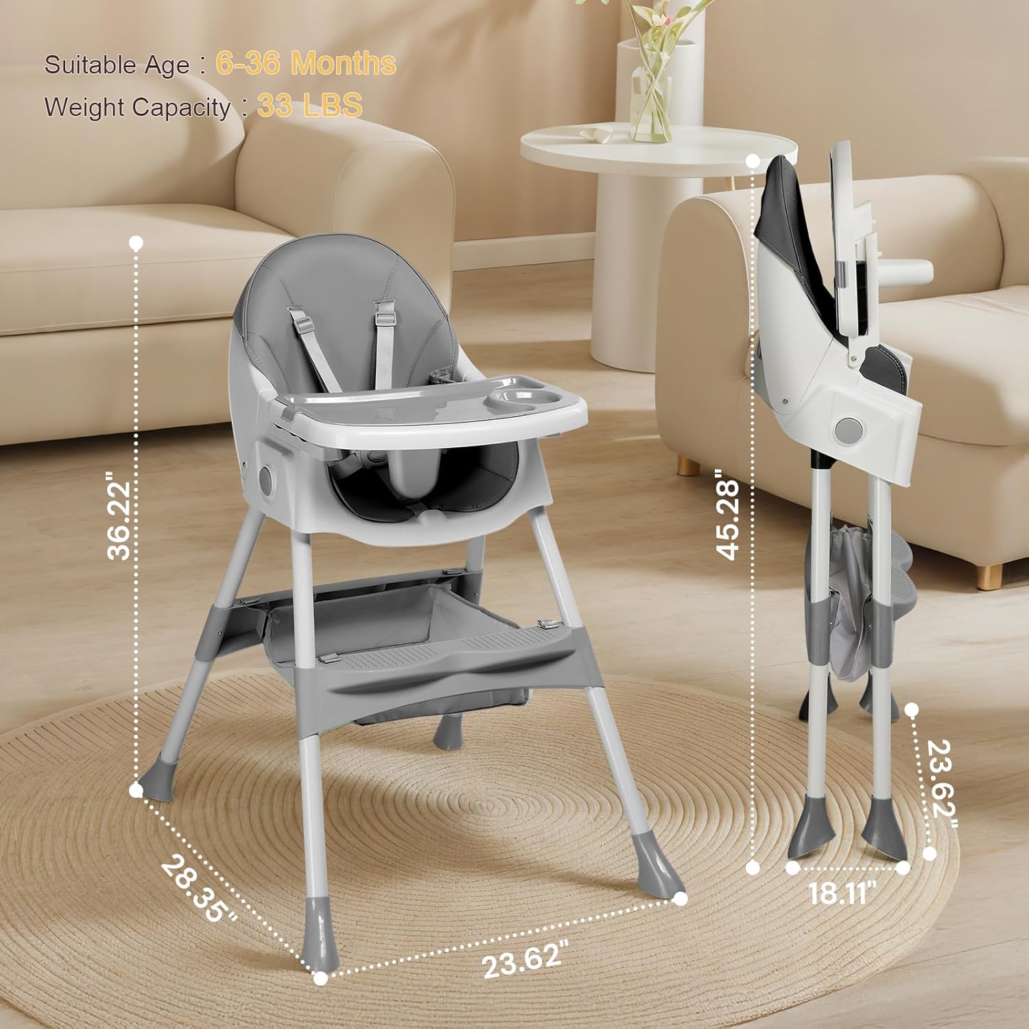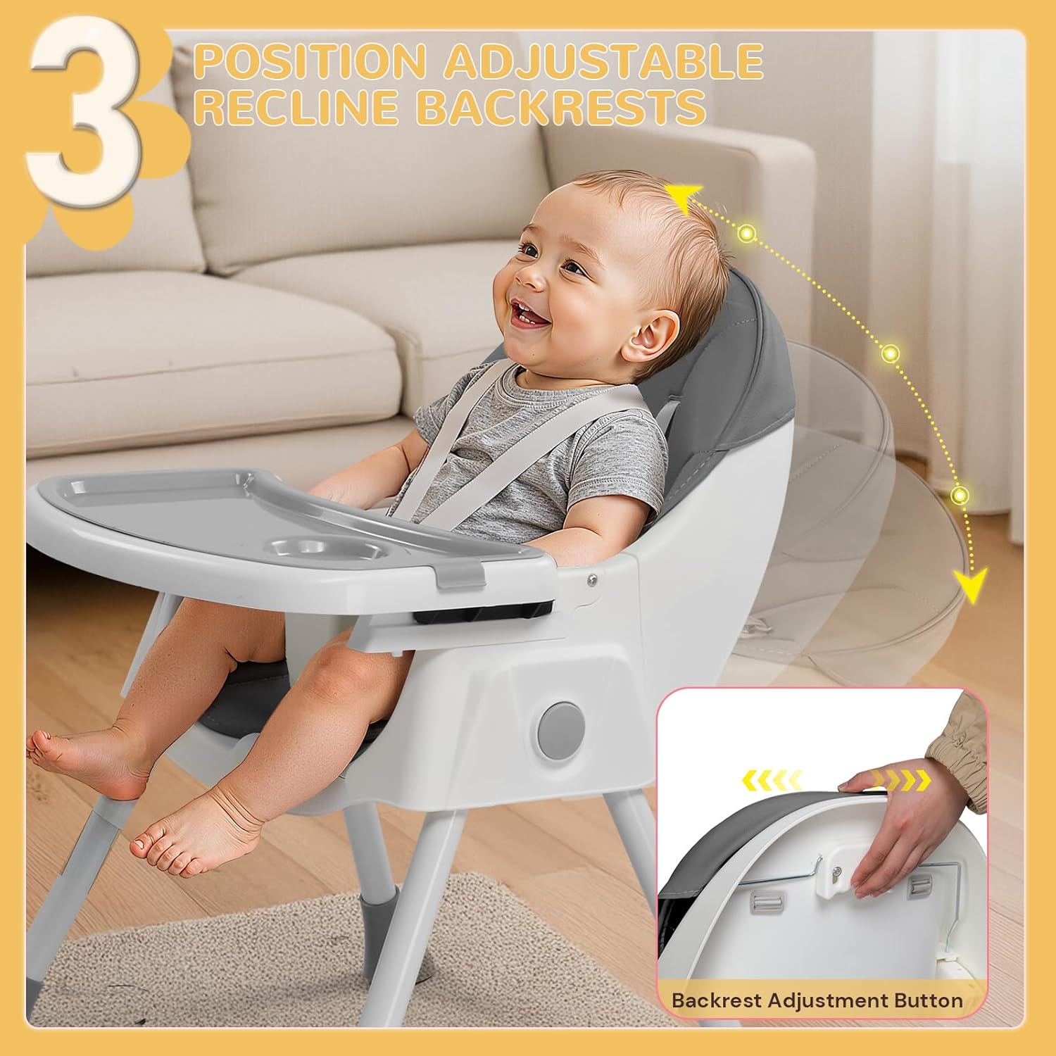【ADJUSTABLE & VERSATILE DESIGN】This baby high chair grows with your kids! Features 2-height adjustments, a 3-position reclining backrest, and a removable dual-layer tray for easy transitions from feeding to playtime