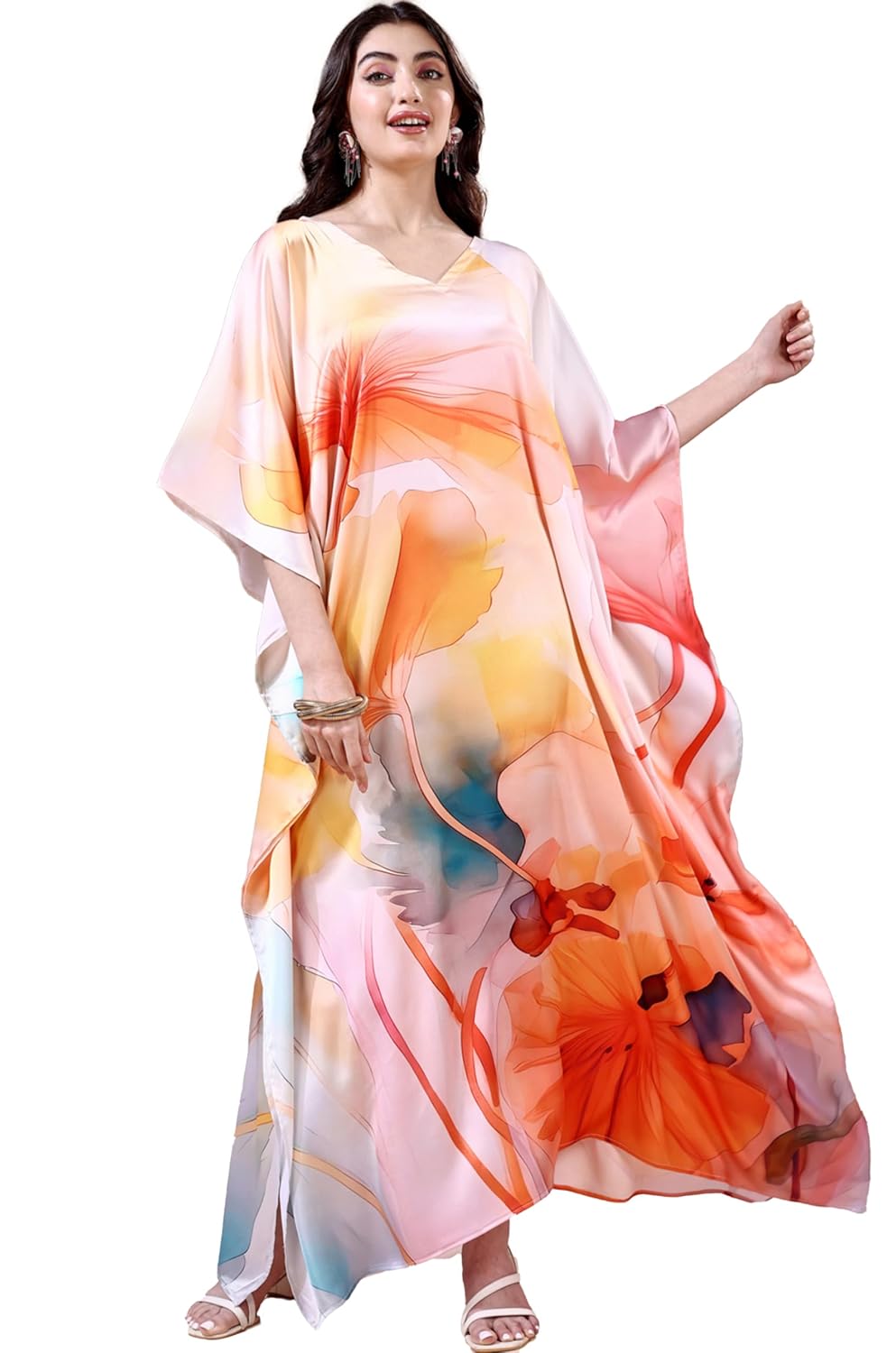 Label Aarna Premium Soft Satin Kaftan Dress for Women / Digital Print / Free Size (M-3XL) / Hidden Adjustable Belt / Full length / Maxi / Resort Wear