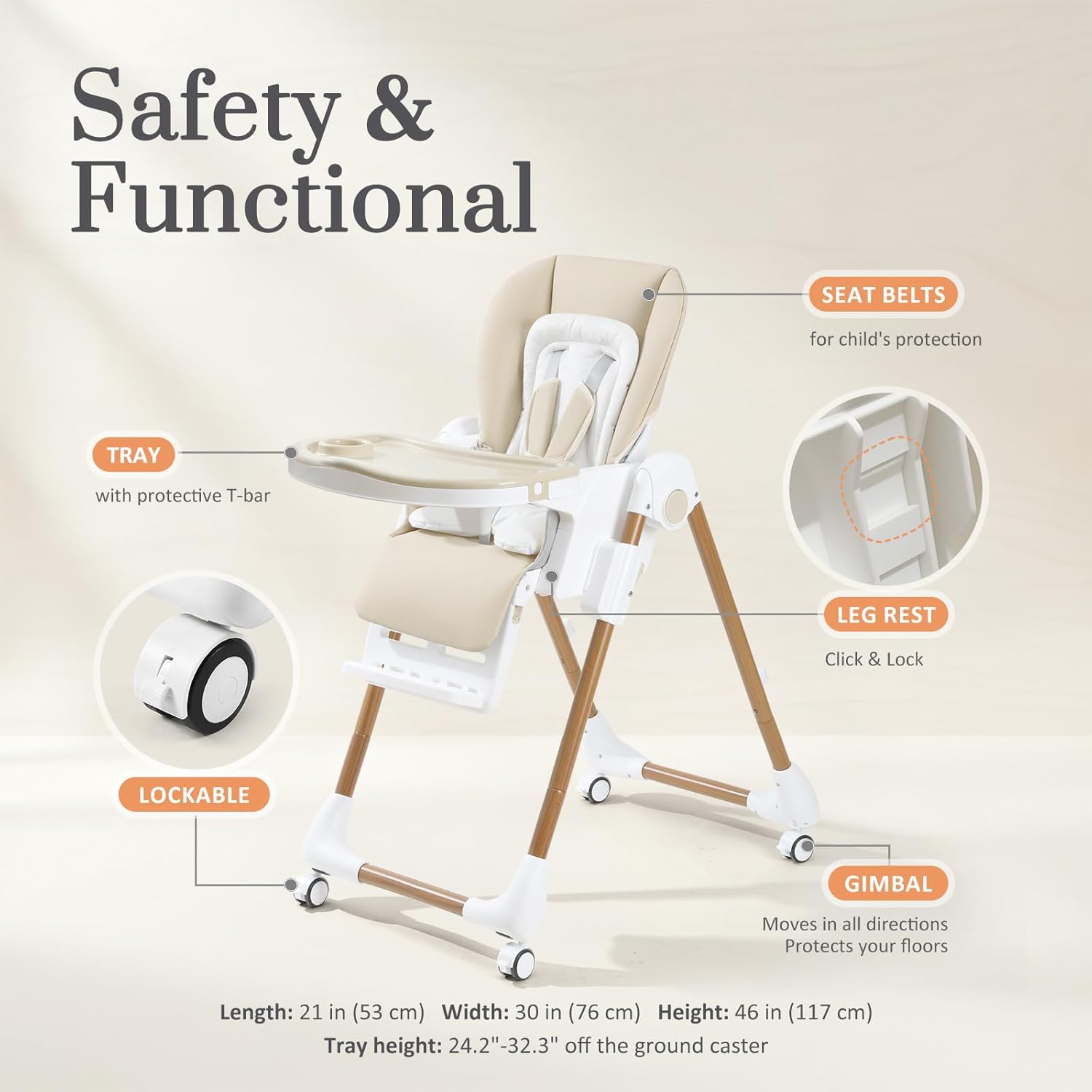 SAFE & COMFORTABLE: Keep your little one safe and confortable in every meal with a secure 5-point harness and padded shoulder straps. The plush dual-layer cushion made of soft cotton and predium PU, providing cozy comfort while smooth rounded edges ensure your high chair both safe and stylish for your growing child