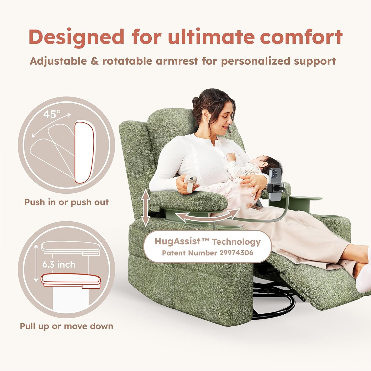 Comfortable & Versatile for Nursing and Relaxation: This glider rocking chair features adjustable HugAssist ergonomic armrests that move up and down and rotate, designed to support your arms in a natural position. The 30° rocking and 270° swivel motion ensure smooth, effortless movement, making late-night feedings and soothing your baby more comfortable. Ideal for bonding time or relaxation, it’s a functional addition to any nursery