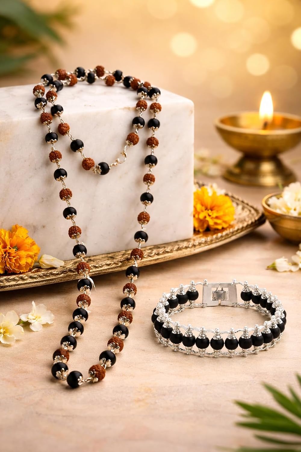 Combo of Silver Plated Rudraksha Karungali Mala & Karungali Bracelet – Spiritual & Stylish Set Enhance your spiritual journey and daily style with this premium Combo of Silver Plated Rudraksha Karungali Mala and Karungali Bracelet. Thoughtfully crafted using natural Rudraksha beads and authentic Karungali (Ebony wood), this combo blends traditional spiritual significance with modern elegance. The silver-plated spacers and fittings add a refined finish, making it suitable for both devotional use and everyday wear. The mala is ideal for japa, meditation, yoga, and spiritual practices, while the Karungali bracelet offers a powerful yet stylish accessory for daily protection and positive energy. This combo is perfect for men and women who seek peace, balance, and spiritual strength. Key Features:- Premium Combo Set: Includes 1 Silver Plated Rudraksha Karungali Mala and 1 Karungali Bracelet Natural & Authentic: Made with genuine Rudraksha beads and Karungali (Ebony wood) Silver Plated Finish: High-quality silver plating for durability and elegant shine Spiritual Significance: Helps promote calmness, positivity, focus, and protection Comfortable to Wear: Lightweight, skin-friendly, and suitable for daily use Unisex Design: Perfect for men and women Ideal Gift Choice: Great for festivals, puja, meditation, yoga, birthdays, and spiritual occasions Perfect For: Meditation Japa Yoga Daily Wear Spiritual Gifting Puja & Rituals