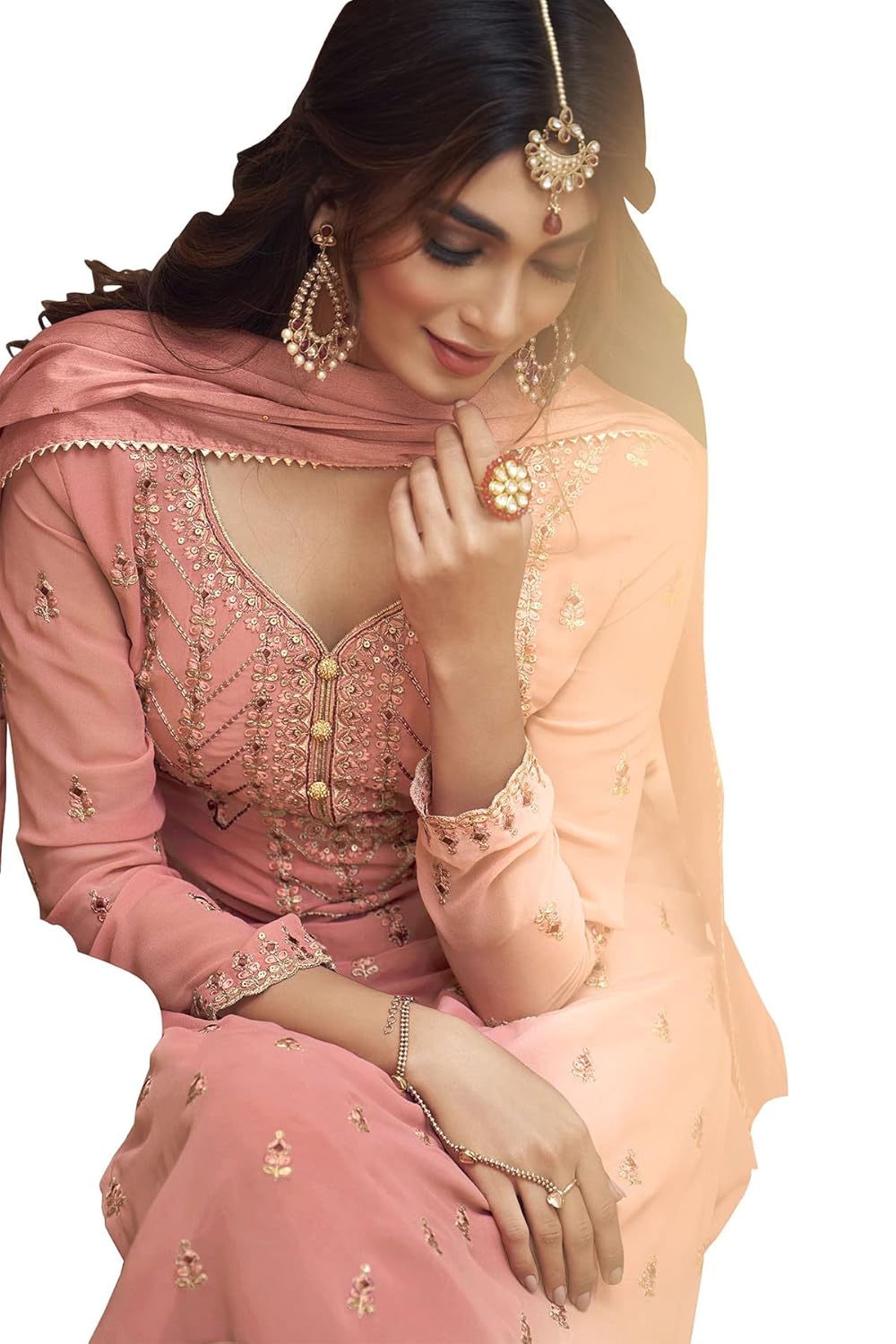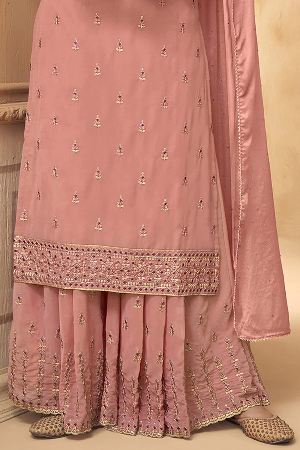 Pink color salwar suit embroidered with heavy dupatta Chinnon semi stitched party wear