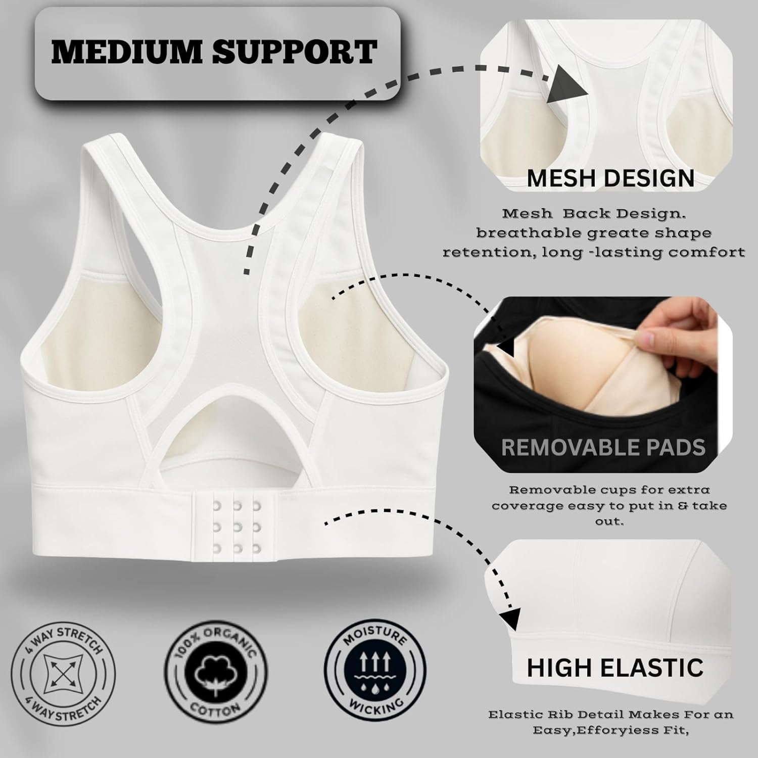 Shoppy Villa Women’s Padded Sports Bra with Mesh Racerback | 4-Way Stretch, Moisture-Wicking, Removable Pads, Adjustable Hook Closure for Gym, Yoga & Workout