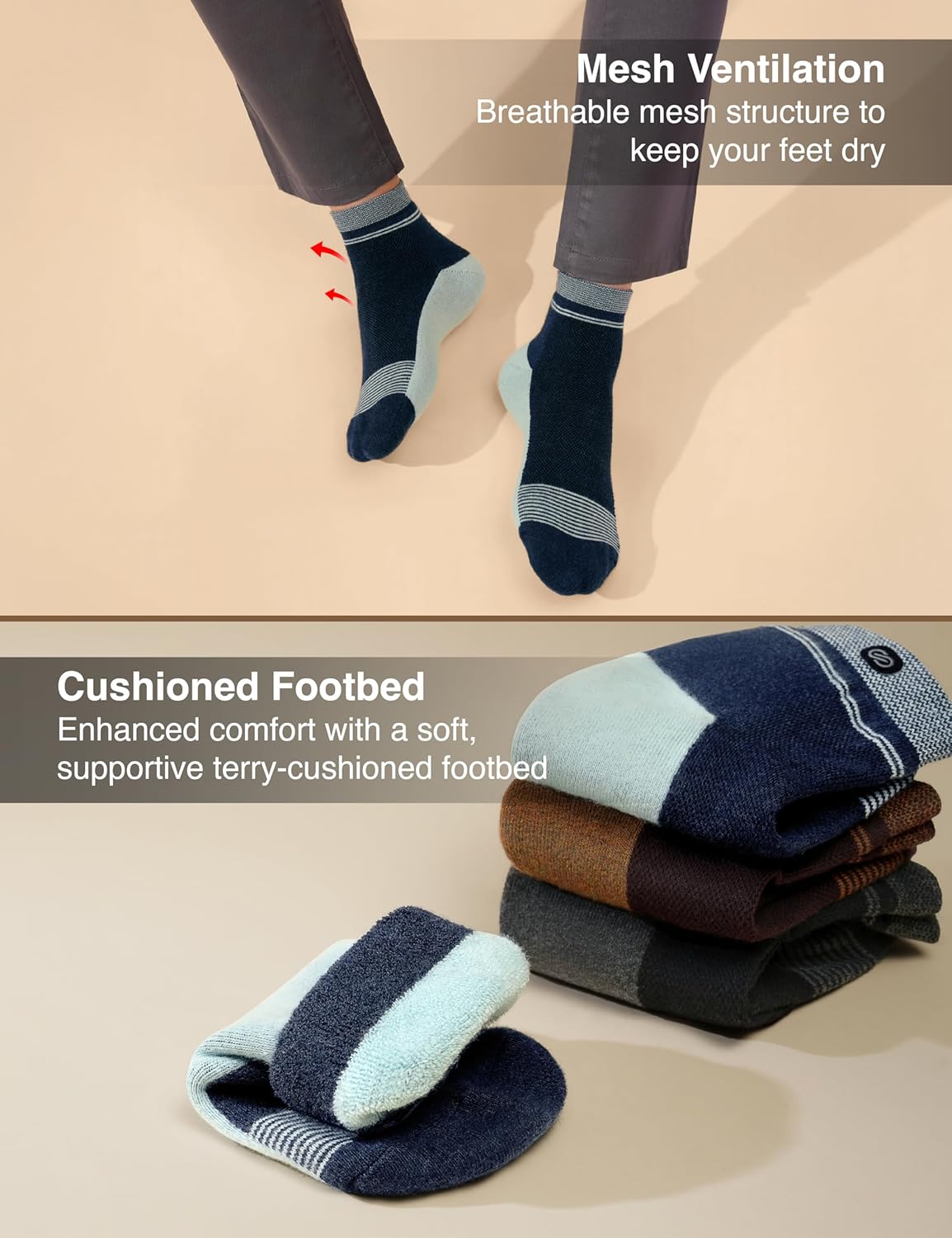 Discover exceptional comfort with Symbol Premium High Ankle Half-Terry Cushioned Socks, crafted from premium cotton with a mesh structure for superior breathability and ventilation. Advanced N9 anti-microbial and anti-pilling treatments ensure long-lasting freshness. The perfect high ankle design and smart-fit construction, combined with strategic mesh zones, provide lasting comfort throughout your day. These socks offer the ideal blend of sophistication and comfort to elevate your everyday style.