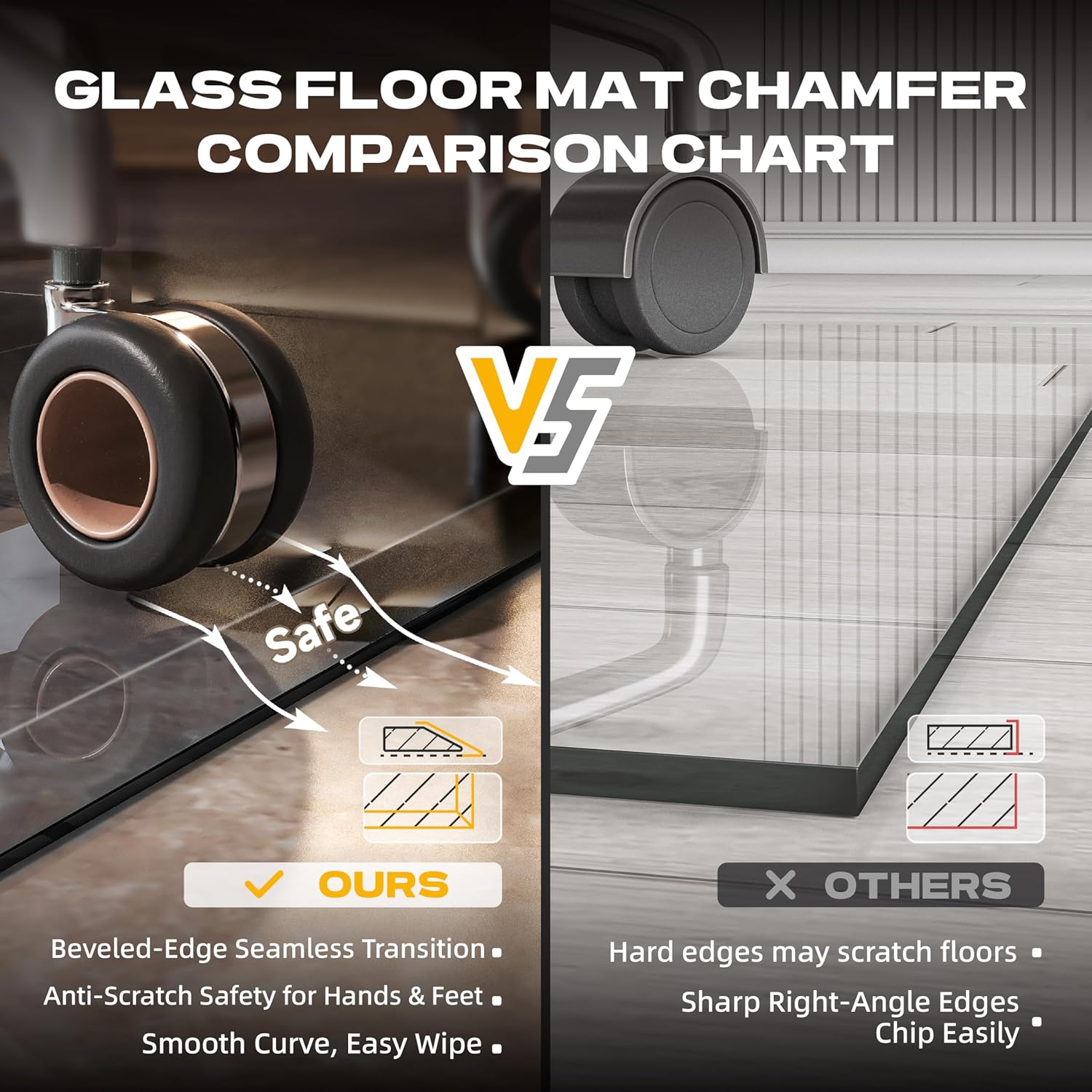 BEVELED DEGE DESIGN: Easily roll your chair up or down without leaving grooves or dents in the wheels. This heavy-duty curved edge design not only functions to prevent the chair cushion from breaking, but also aesthetically displays and protects the floor underneath with its virtually transparent surface, while maintaining the perfect position
