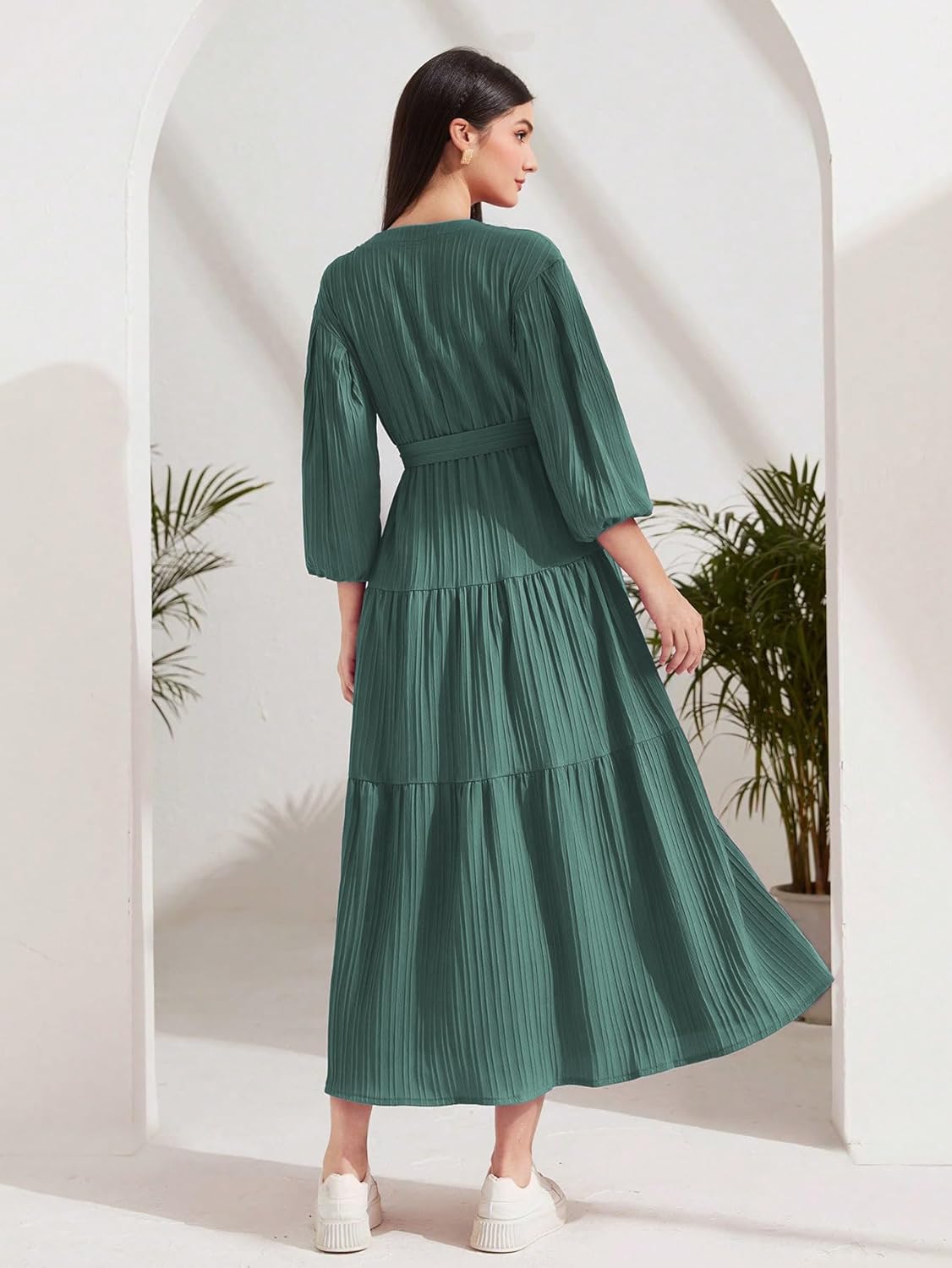 Elevate your wardrobe with the TOPLOT pleated maxi dress. Designed with a flowing silhouette and a flattering fit, this dress features a V-neckline and long, billowy sleeves that add a touch of sophistication. The pleated texture enhances the graceful movement of the fabric, while the matching waist tie cinches the waist for a more defined shape. Perfect for casual outings or special occasions, this versatile piece pairs beautifully with sneakers for a laid-back look or heels for a more polished ensemble.