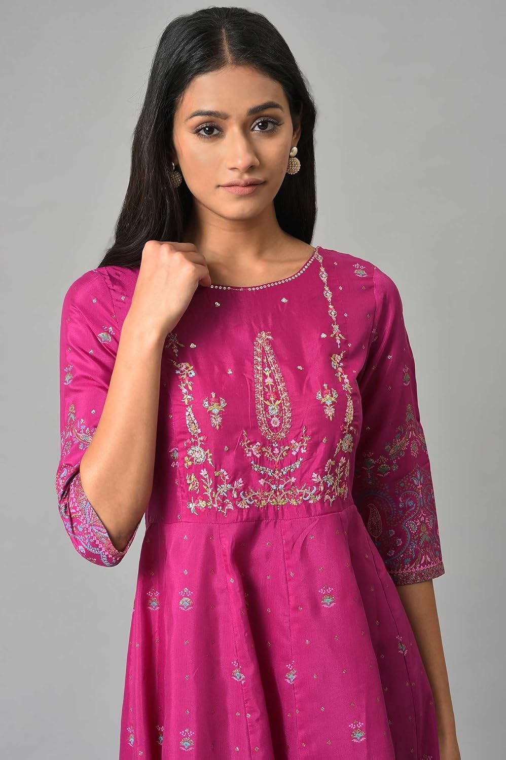 Mulberry floral printed panelled dress with colourful thread and metallic embroidery on yoke.