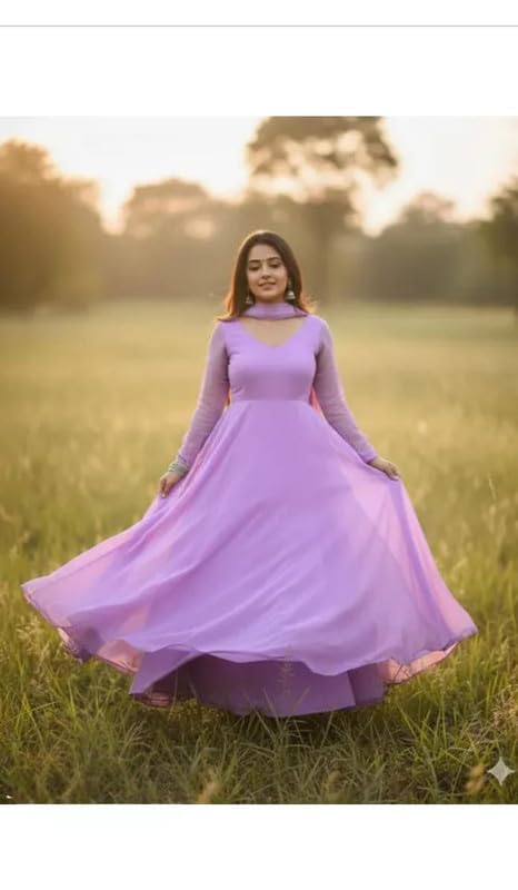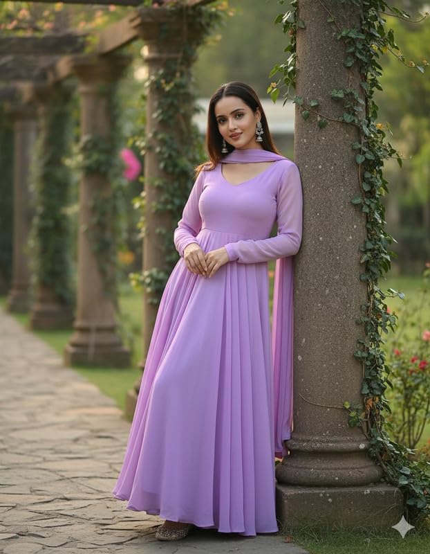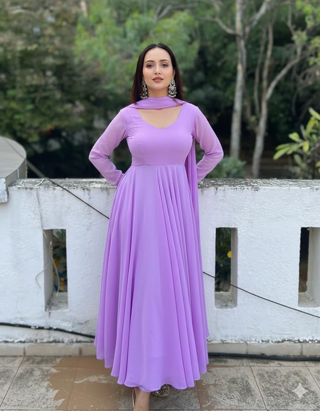 Womens Georgette Anarkali Purple Kurta with Dupatta | Long Sleeves | V-Neck | Long Ethnic Anarkali Gown Dress for Women | Festive, Wedding