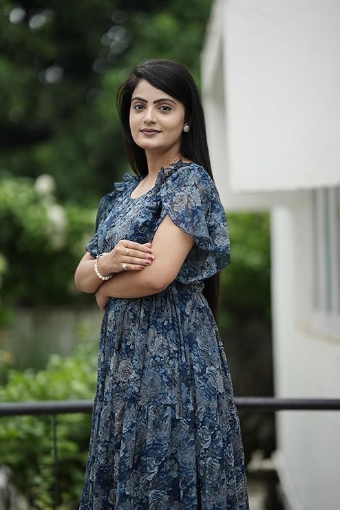 Make a stunning style statement with this exquisite Georgette maxi dress that combines elegance with contemporary fashion. The digital floral prints add a vibrant charm to this Western-style long gown, making it perfect for special occasions and evening gatherings. Crafted from flowing Georgette fabric, this dress offers graceful movement and comfort throughout the day. The maxi length creates a sophisticated silhouette, whilst the one-piece design ensures hassle-free dressing. The beautiful floral pattern brings a fresh, feminine appeal to your wardrobe. This versatile gown can be accessorised with statement jewellery and heels for a complete ensemble. The dress is ideal for parties, formal events, or whenever you want to make a lasting impression. The lightweight fabric makes it suitable for various seasons, and the flowing silhouette flatters different body types.