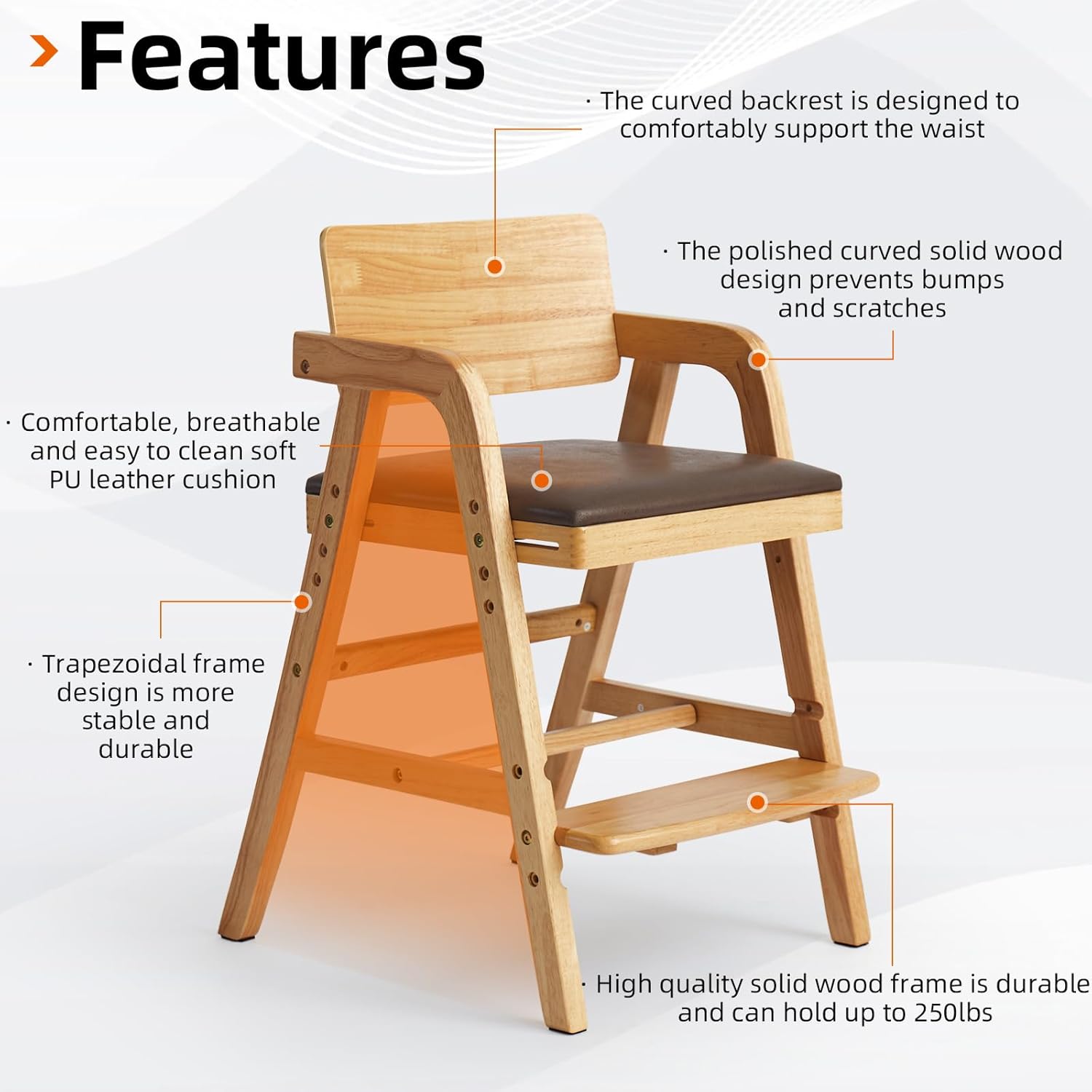 Reliable Safe and Ergonomic – The toddler high chair is made of solid walnut wood, this toddler chair offers exceptional impact resistance and stability. Waterproof PU leather-covered seat cushion, soft and comfortable with easy cleaning. It’s trapezoidal design enhances sturdiness, supporting up to 250 lbs. The wooden high chair’s wide, soft seat and low, sturdy backrest provide ergonomic support for your baby, ensuring a safe and stable seating position