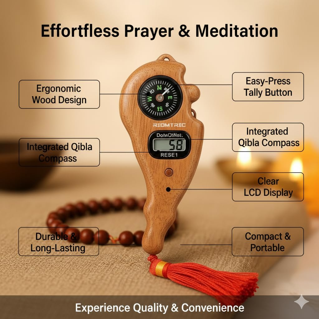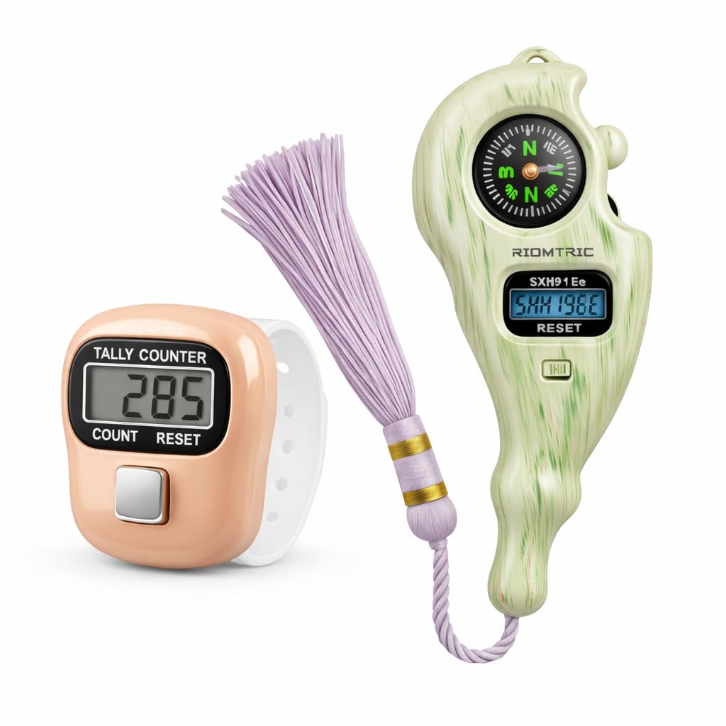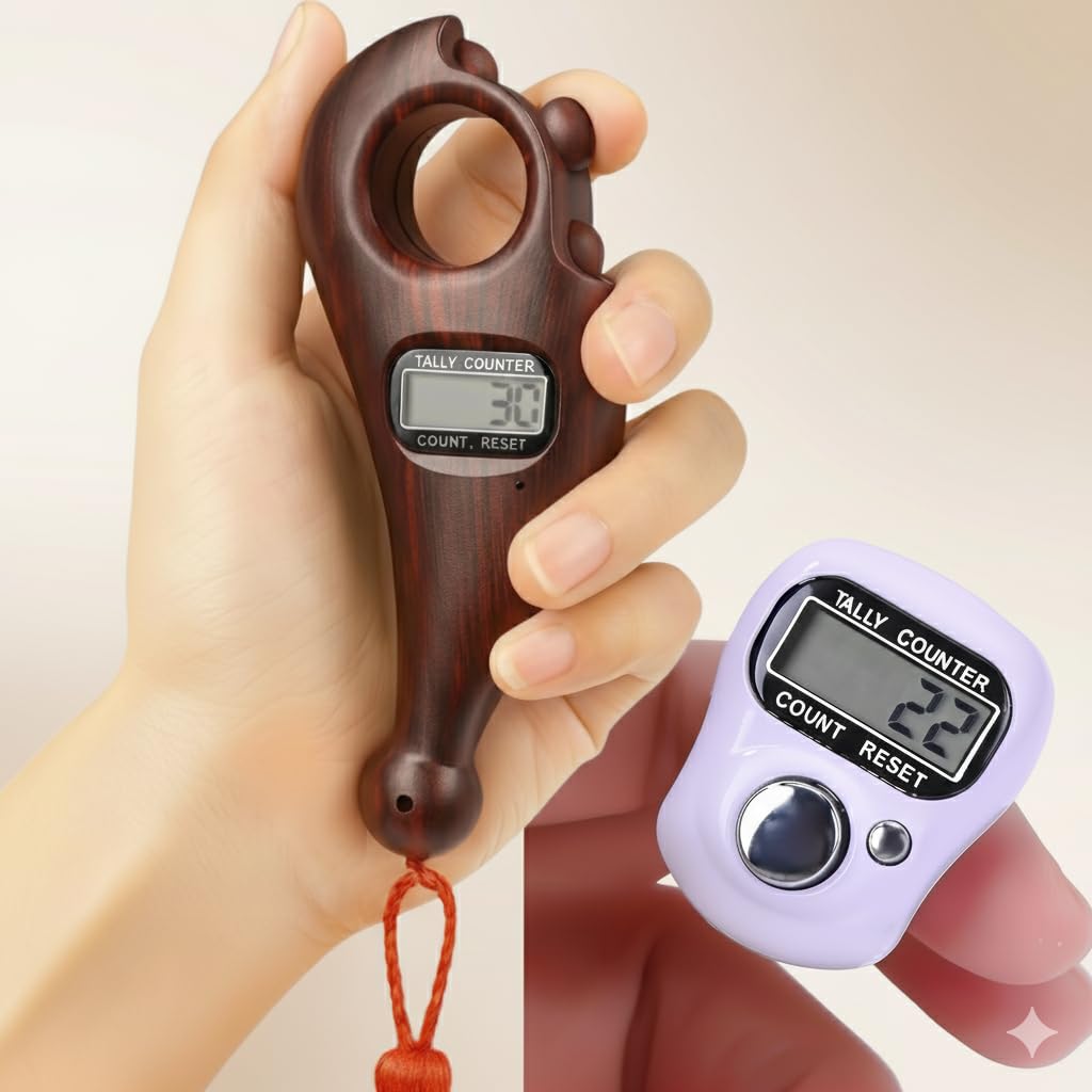 Mantra Jaap Mala Digital Counter Tally Counting with Compass Machine Finger Portable Hand Mini Ring Tasbih Misbaha -Different Use Naam Mantra Jaap Cricket Umpire (Jaap Counter-Combo) Digital Tally Counter with Wrist Strap Stay focused and count with ease using this portable and practical digital finger counter. Designed to be worn comfortably on your finger like a watch, this tally counter features a large, easy-to-read LCD screen that clearly displays your count up to 9999, ensuring accuracy for every task. The intuitive single-button design makes counting effortless—simply press the large silver button to advance the tally, and use the smaller reset button to instantly clear the count back to zero. Perfect for Zikr/Tasbih prayers, tracking laps, knitting rows, attendance, inventory, or any activity requiring precise, repetitive counting, this lightweight and durable counter is powered by a long-lasting battery, making it an essential tool for convenience and concentration.